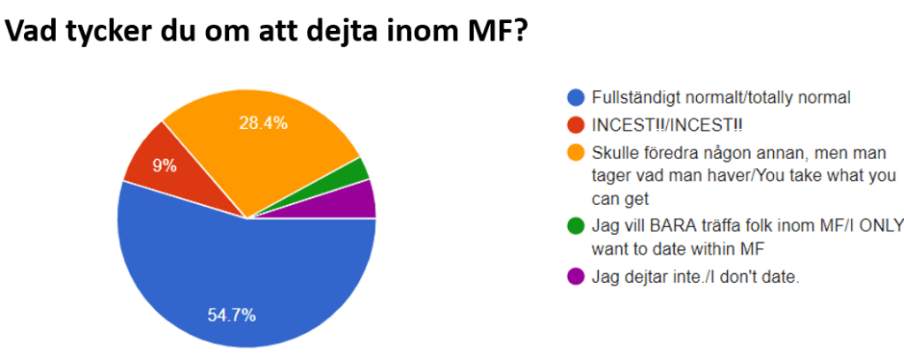 När det kommer till åsikter om dejting inom MF är en majoritet överens om att det är fullständigt normalt. 28% hade föredragit någon annan, men nöjer sig med vad de kan få, medan 9% tycker att det rent ut sagt är incest att dejta andra MF:are!