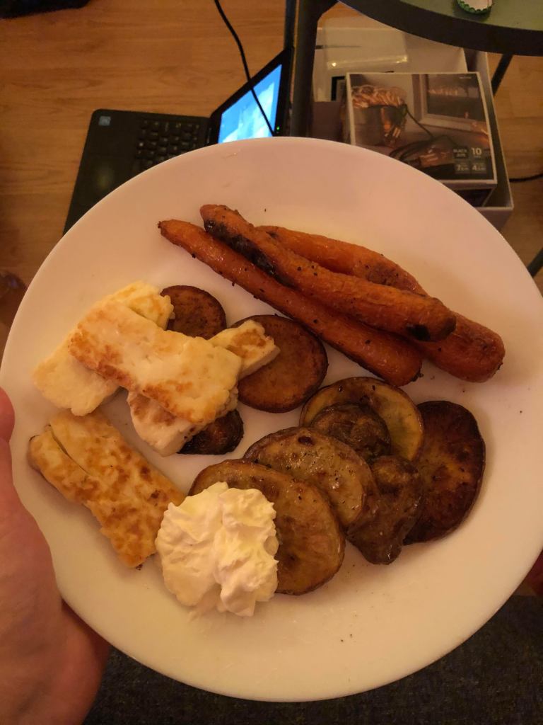 Huvudrätten bestod av potatis, morötter och halloumi tillsammans med yoghurtsås med honung och citron.