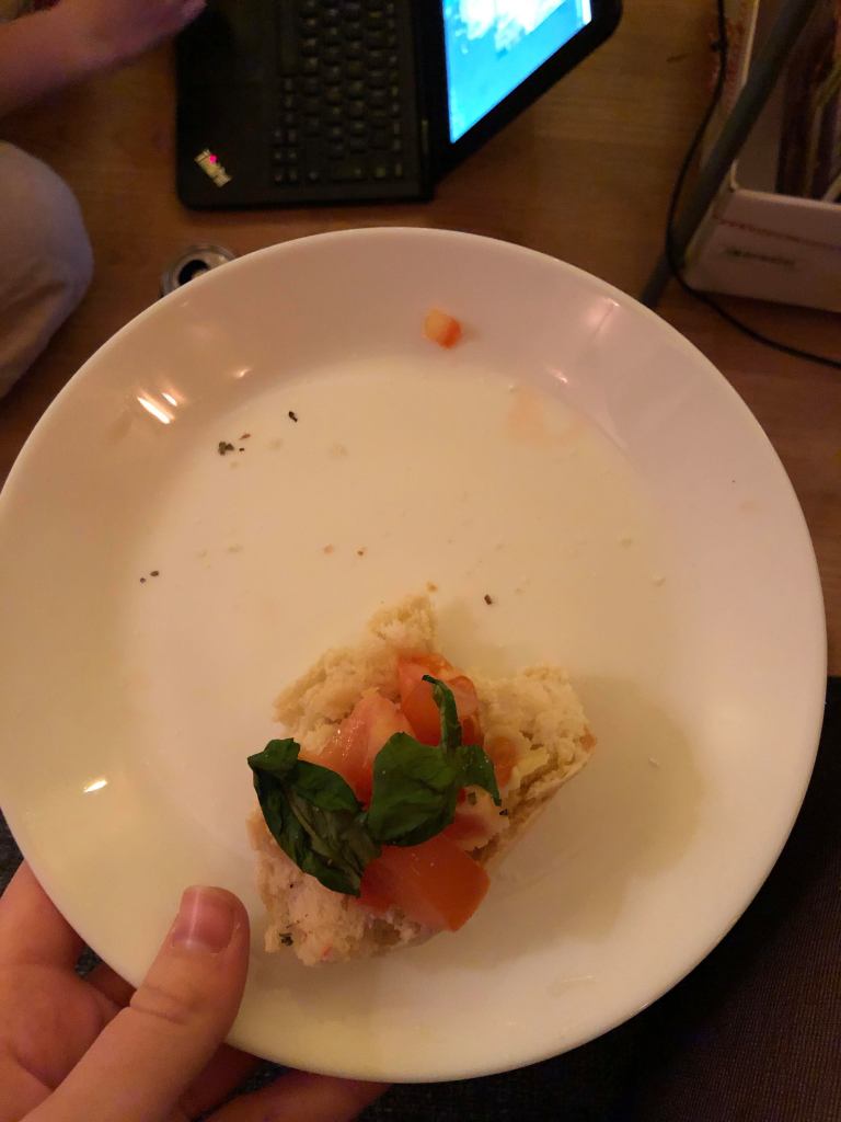 När denna bilden togs hade tyvärr nästan hela förrätten ätits upp. Vi lovar att bruschettan med tomat och basilika såg mer aptitligt ut innan.