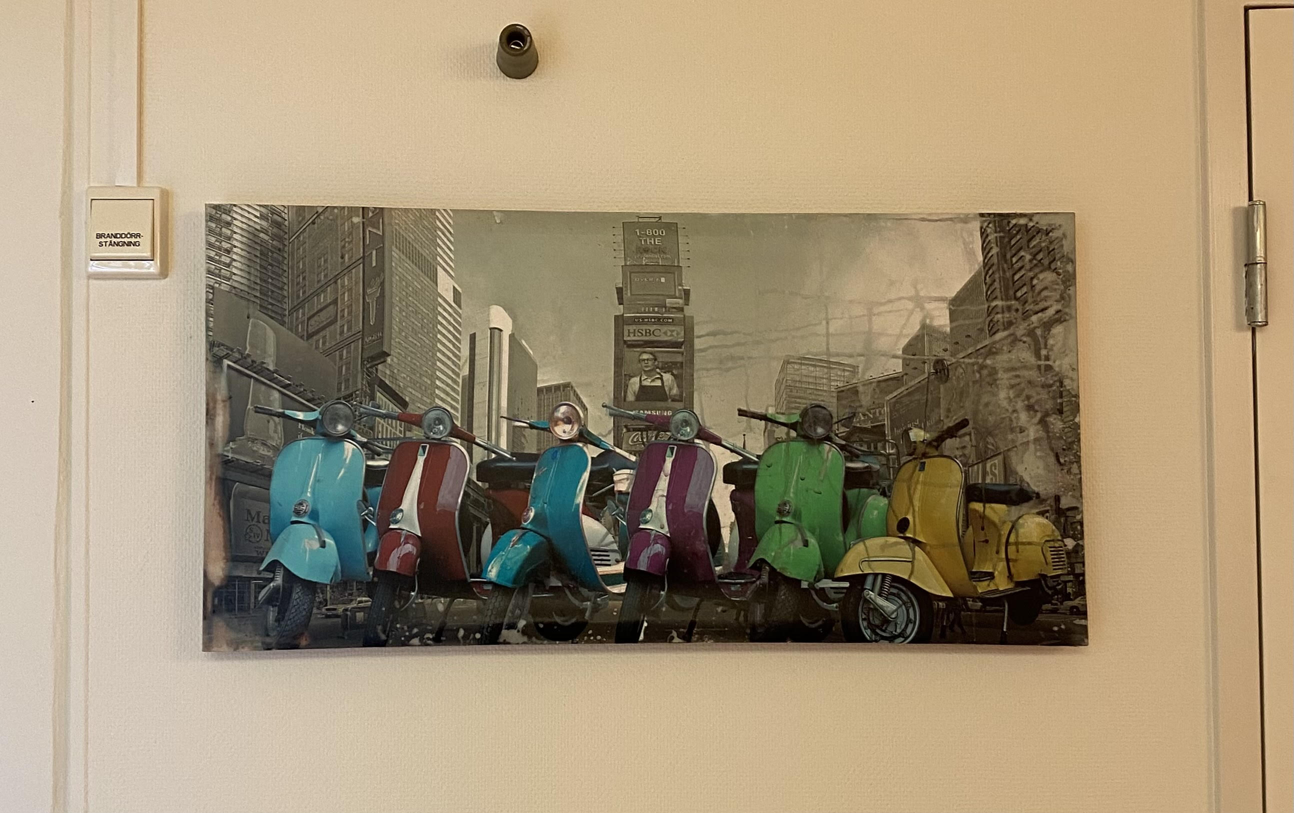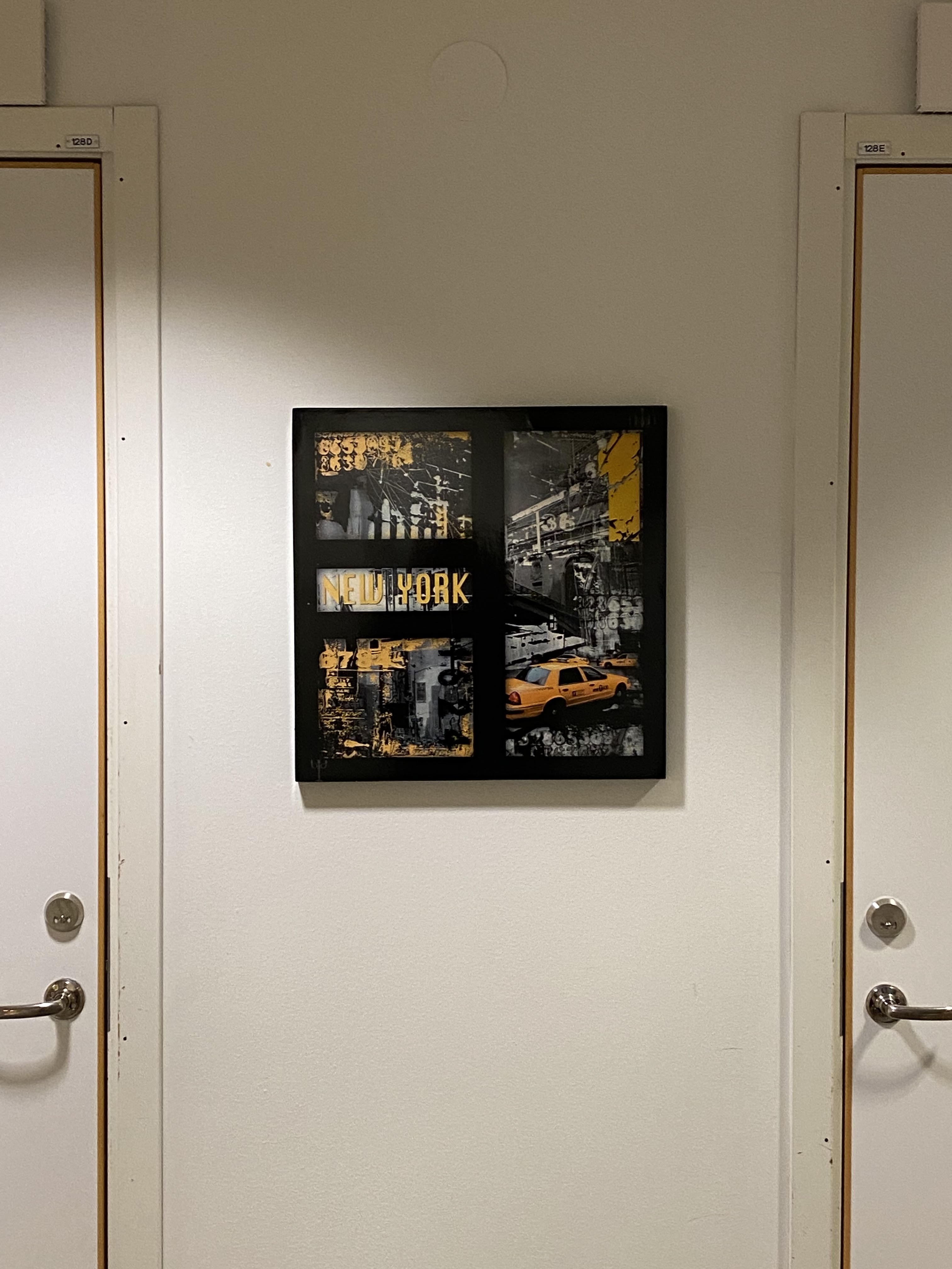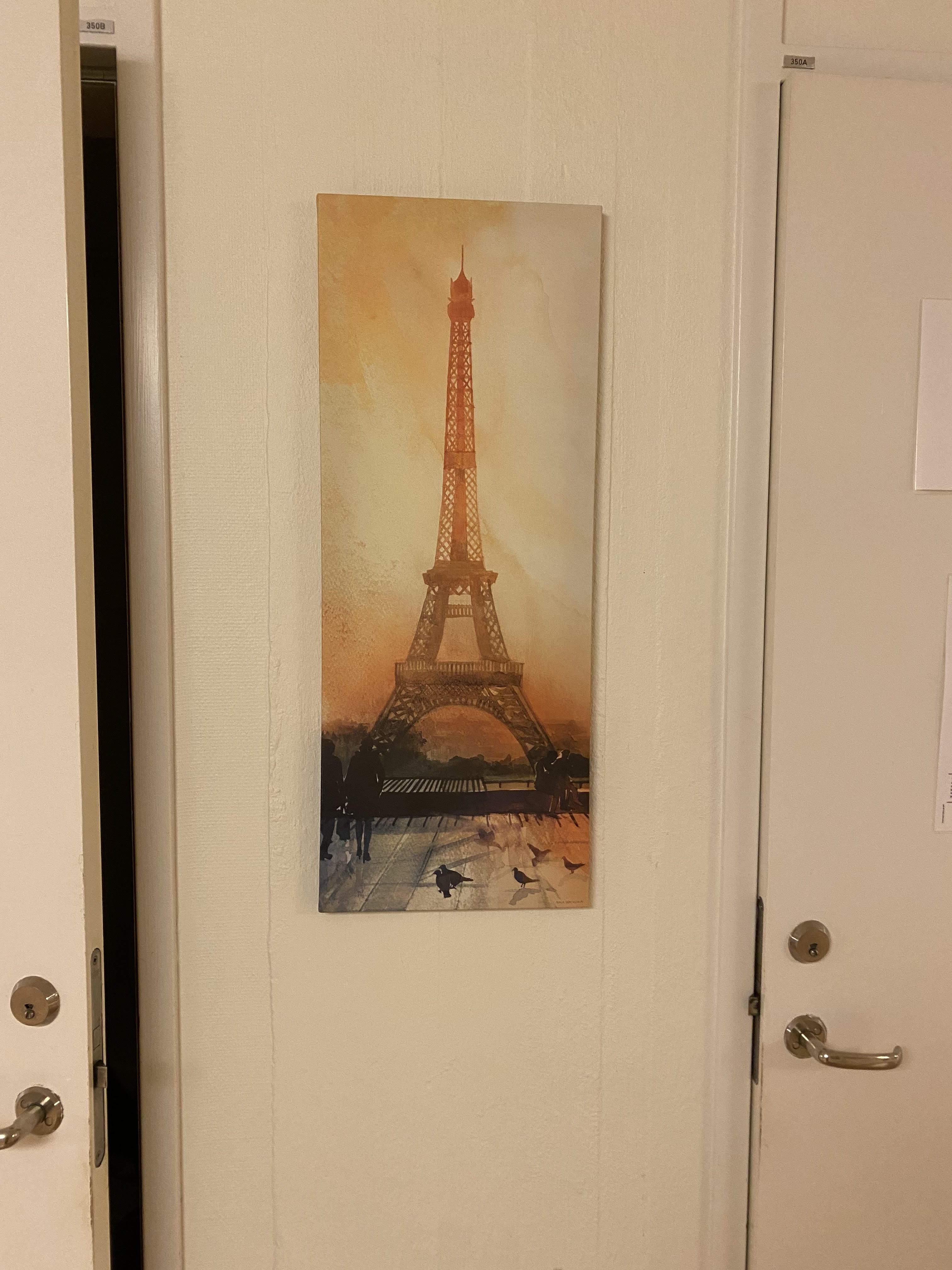 Det som skiljer HSC:s konstsamling från andra offentliga byggnaders dito är, utöver den stora spännvidden på genrer och teman, också kvantiteten. Jag fick det till 412 objekt, varav 26 föreställer Eiffeltornet! En fråga man kan ställa sig är hur detta påverkar studenternas prestationer. På Lunds universitets hemsida står det att “HSC har en stimulerande utbildningsmiljö”. Med ”stimulerande” misstänker jag att man menar ”kognitivt överstimulerande”? För att undersöka detta tar jag med er på en hypotetisk vandring genom lokalerna från punkt A (entrédörrarna) till punkt B (ett PBL-rum).
