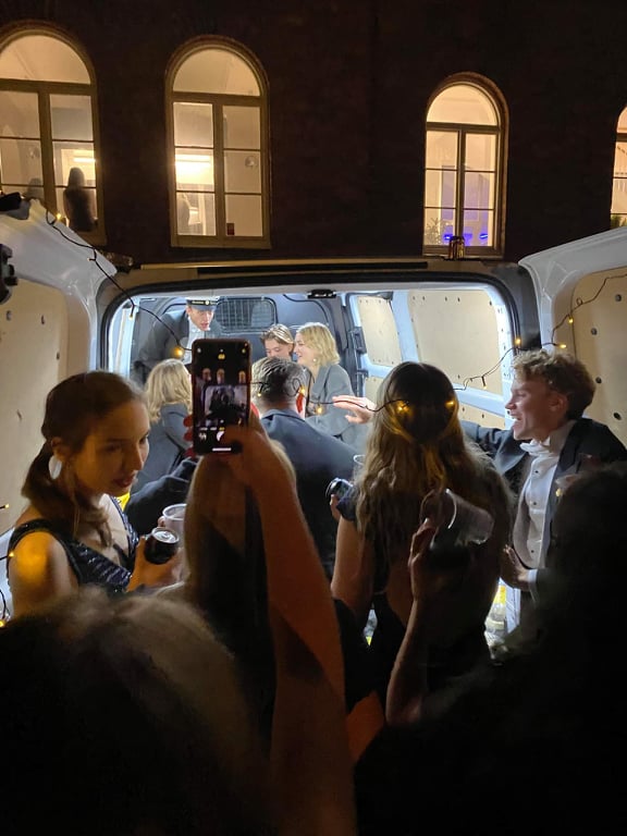 Marskalksexan är en skåpbil. Jag har aldrig dansat inuti en skåpbil förut. Nu står jag med en jelzinbox i handen och tjugo ungar klädda som nobelpristagare runt mig och gör det. Det är lite för mycket för en vodkamarinerad tjugoettåring att hantera.