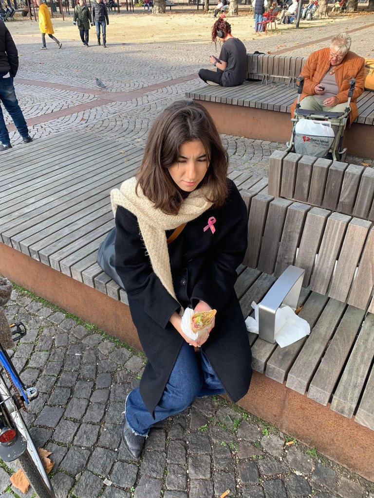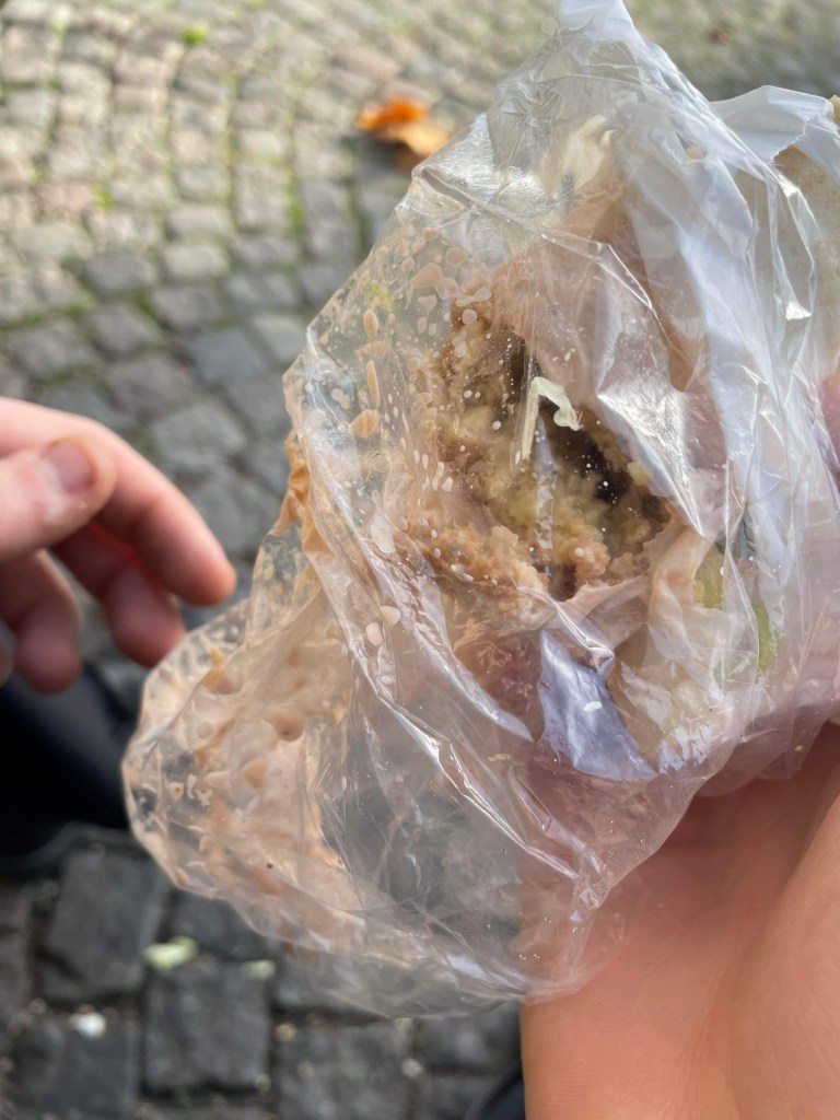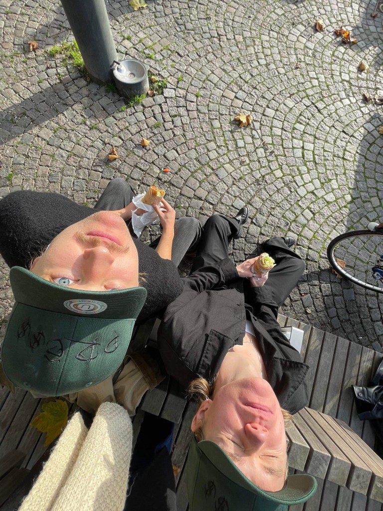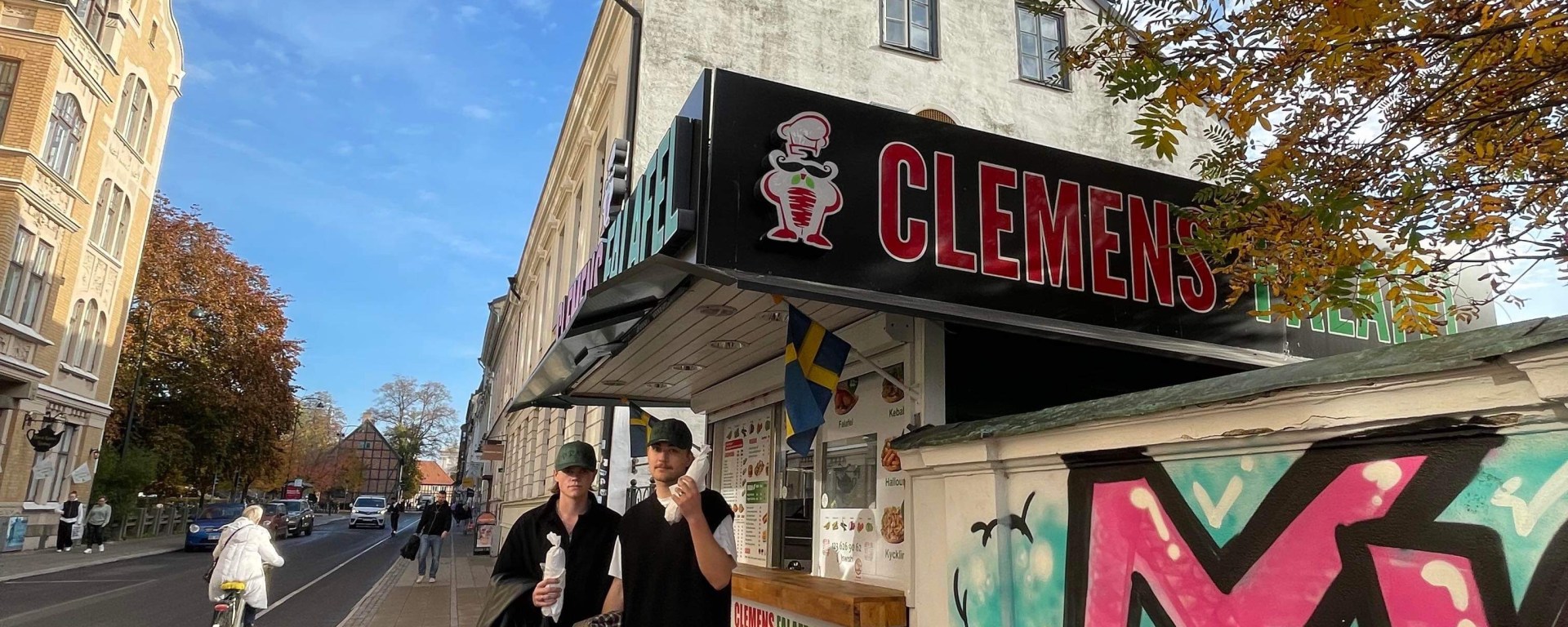 Det andra som inte får hända har hänt. Vår fotograf var i tid till skillnad från oss som rullade in våta och några minuter sena. Den här jävla klimatkrisen va? Vilken skit! Nog om det, vi är här för att prata om falafel – inte kasta tomatsoppa på Van Gogh. Något vi däremot kan kasta är beröm på Clemens Falafel. Denna holk av godheter hittar ni intill centralen på hörnet av Clemenstorget. Ryktet säger om man är extra snäll kan man få smakprov av falafel medan man väntar på sin rulle. Antar att vi var elaka idag för vi förblev tomhänta medan vi väntade. Med rulle i hand rörde vi oss bort till en solig bänk på torget. Vi slog oss ner bredvid en tom Sofiero Gold långhylsa. Riktig lundkänsla.