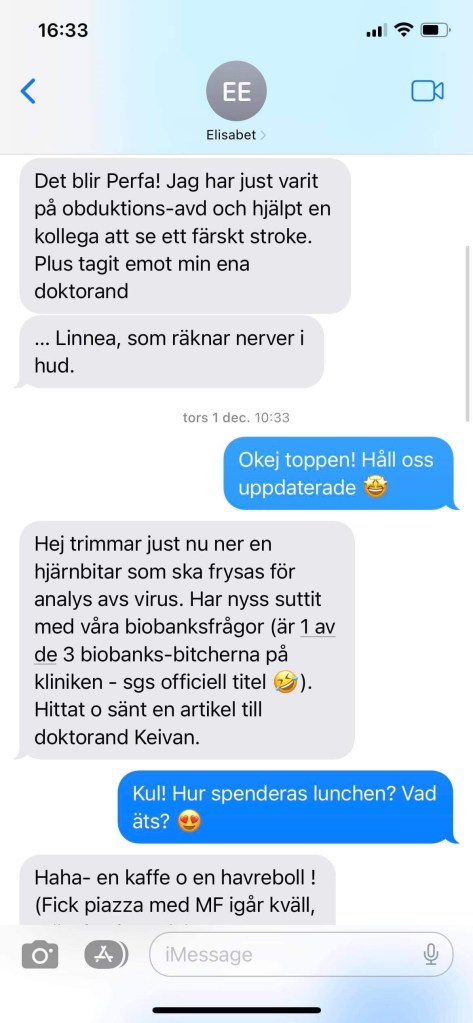 Man märker snabbt att det är många som vill nå Elisabet och ha en del av hennes tid, uppmärksamhet och expertis. Bara under vårt möte träffar vi flera doktorander, ST-läkare och forskarkollegor som ställer olika frågor. Vi får även sitta med när hon handleder sin doktorand Keivan Javanshiri som ska jobba på bildtexterna i sin kappa (doktorandbok). Stämningen är så god att till och med Sondrea börjar fundera på att doktorera någon gång i framtiden.