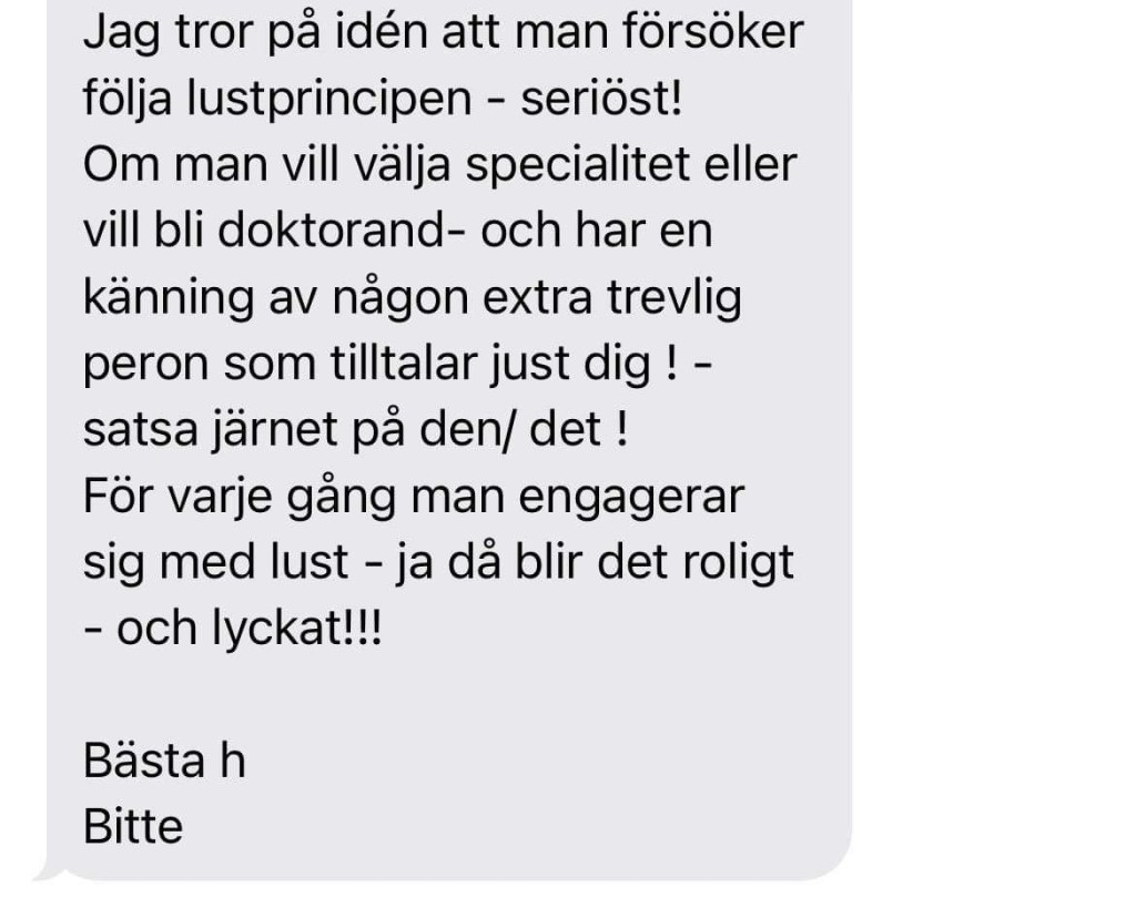 Vi frågar också vad hon har hade gett för tips till sig själv som läkarstudent, eller bara generellt till oss som pluggar, och Bitte är väldigt tydlig med sitt svar. Så pass att hon upprepar det på sms senare. LUST!