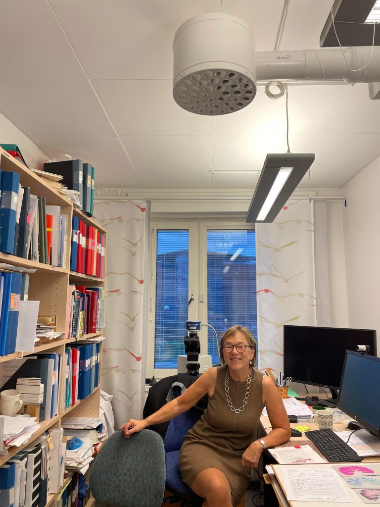 Hur såg Bittes väg till patologen ut? Efter termin fyra på läkarprogrammet, den ökända patologiterminen som ligger framför Sondrea, valde Bitte att ta uppehåll. Hon ville vara på neuropatologen men kunde inte få någon betald praktik. För att få pengar jobbade hon som sjukvårdsbiträde på akuten och på varje rast sprang hon över till neuropatologen. Hon beskriver Patologen på den tiden som en väldigt rolig miljö där handledaren satt och rökte pipa medan de mikroskoperade och tillsammans upptäckte White Matter Disease, demenssjukdom. Sedan läste hon klart läkarprogrammet och följt på det så disputerade hon, innan hon började jobba på patologen fulltid. Hennes tid på patologen har varit lång och hon hade samma rum i över fyrtio år, fram tills att hon nyligen bytte.