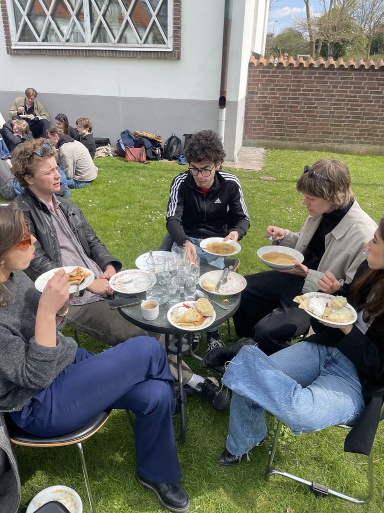På torsdagar serveras det ärtsoppa på Locus Medicus. Att äta ärtsoppa på torsdagar är en tradition som faktiskt sträcker sig ända till medeltiden enligt Edward Blom, en tradition som hedras med bravur av Medicinska Föreningen i Lund. Den som alltid lika fryntliga serveringspersonalen levererar idag två stora slevar soppa och tre pannkakor. Bröd, kaffe, sylt och grädde ingår, ja ni känner till konceptet. I min totala förvirring råkar jag lägga grädde i soppan, något som visar sig smaka helt ok. Soppan avnjuts i Locus härliga trådgård, och vi förskonas faktiskt den efterhängande odör som Ärtan vanligtvis obönhörligen impregnerar kläderna med. Ärtan är en veckohöjdpunkt, både kulinarisk (oftast) och socialt.