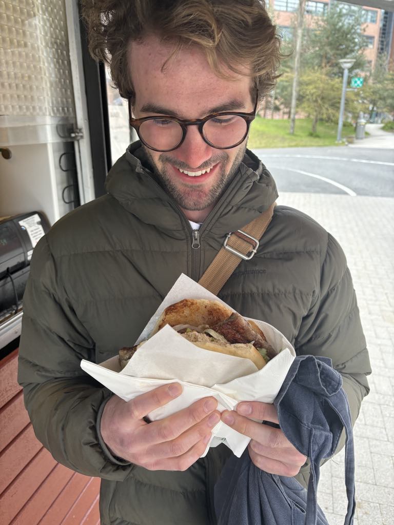 Kontanter mottages gladeligen, och efter en berömmelsevärd kort väntan anländer två hamburgeliknande enheter. Allt dryper av fett, från de avlånga köttbitarna, till brödet, till omslagspappet. Detta ser lovande ut. Matkalaset transporteras tillbaka till Forum Medicum, då det finns begränsade förtäringsmöjligheter i anslutning till matstugan, såvida det inte är varmt nog att sitta på en parkbänk i det närbelägna grönområdet. Cevapcicin inmundigas till stor belåtenhet. Den består av välkryddade ”köttfärspinnar”, ackompanjerat av kajmaksås, fetaost, lök, sallad, tomat och gurka, paketerat i ett varmt, pitaliknande bröd. ”Löken var stekt också kändes det som”, inflikar Sigge träffsäkert. Efter måltiden infinner sig en matkoma av rang, så prominent att den helt klart påverkar studierna. Sammanfattningsvis en måltid för den kalorilystna. Gott och prisvärt var det hur som helst.