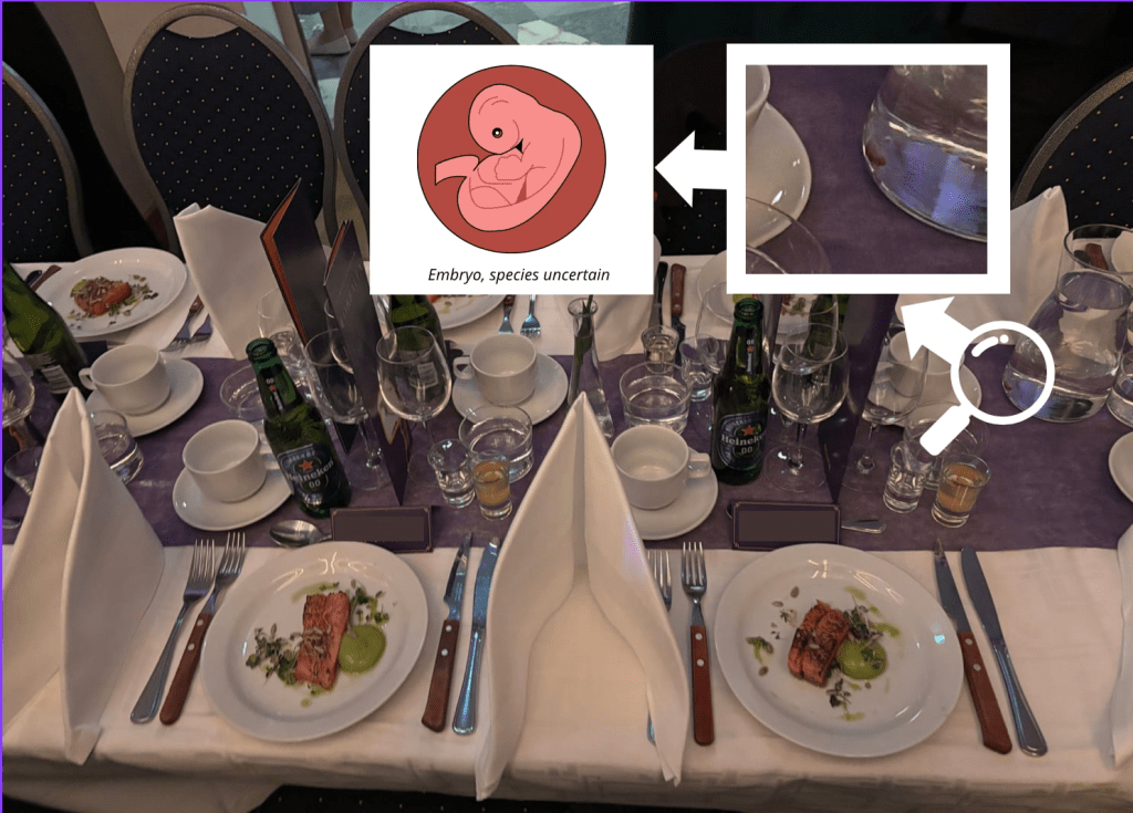 Someone at Corbalen might have taken that motto a bit too literally. Amidst our elegant table setting – a fancy salmon entrée, sparkling glassware, and a side of sophisticated conversation (not really) – we noticed a glass vase that seemed to contain not just the elixir of life, but… evolution in progress. Floating proudly, suspended in pristine H20, there was a peculiar pink, gelatinous specimen. Naturally, as freshly trained embryologists, we performed an immediate (and highly unverified) classification: Embryo, species uncertain. Whether this entity was modern art, a misunderstood garnish, or a new model organism, remains undetermined. What’s certain is that it stole the spotlight – and possibly our appetite for a refreshing drink. For documentation purposes, an identikit of the object in question is provided below.