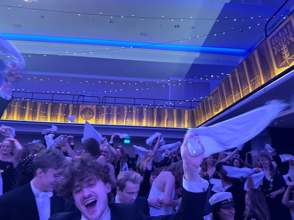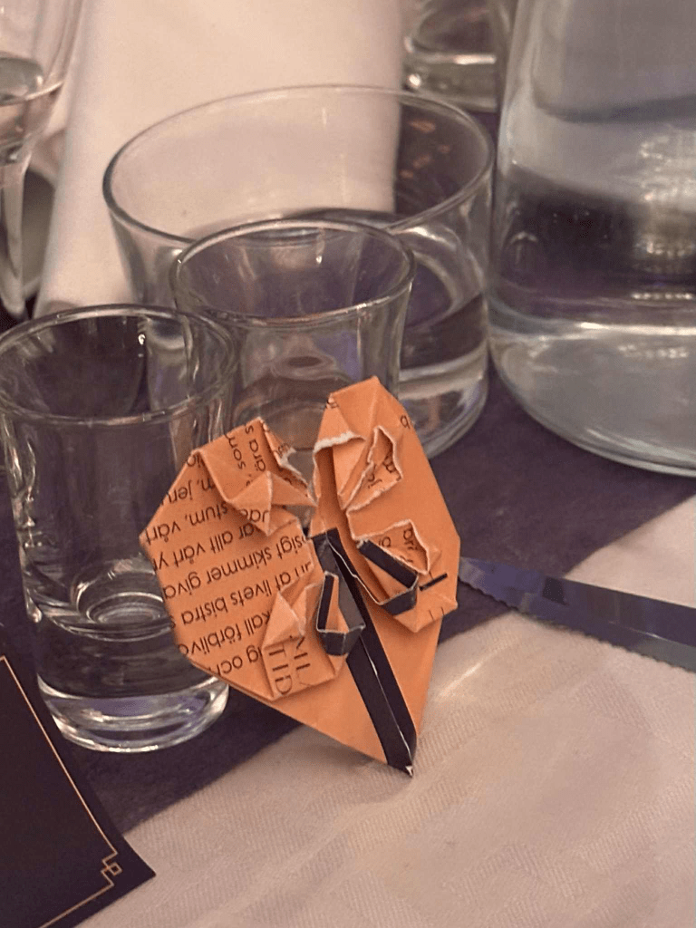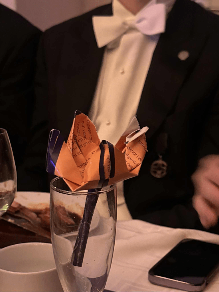 Some people might believe that five hours of sitting in fancy! clothes at a fancy! table with fancy! food could be boring – it is not. At least not, if one finds a creative and fancy! way to spend this valuable time. At Corbalen 2025 such way was found: If one was attentive enough that night, they were able to detect swans and ships fluttering and sailing across the fancy! tables. The fact that these swans and ships were made out of fancy! Corbalen paper-menus makes this story slightly less magical, though not less intriguing. Corbalen 25 was therefore not only about a fancy! evening, but also about people‘s creativity and the smiles of waiters and marskalker when being gifted a magical paper heart or paper rose by the attendees.