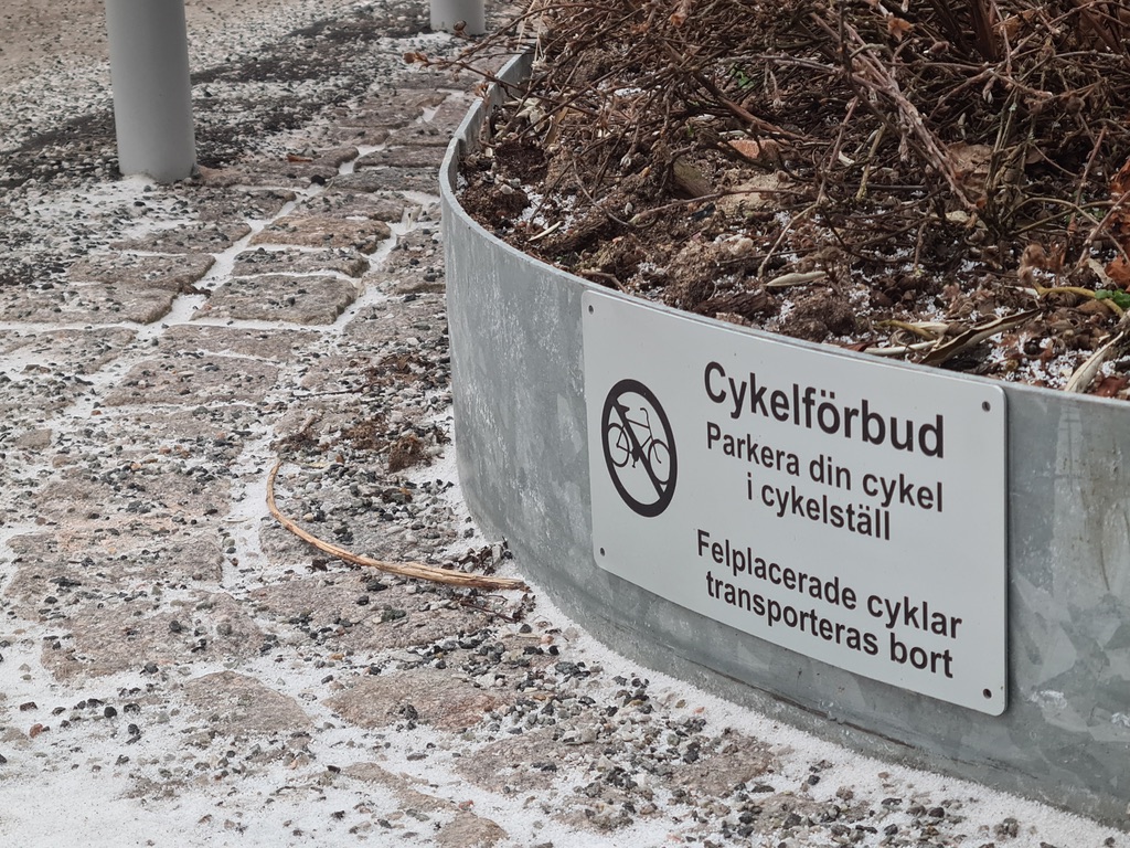 Nu har jag gett det en vecka eller två och får lov att säga “Förlåt, men är det inte SKRATTRETANDE att det på något jävla vänster tillkommit fler cyklar???” För tro fan att det ändå är cyklar som står längs med fasaden (i två bemärkelser, se nedan) och framförallt vid busshållplatsen?? Rullstolsanvändare rullar inte förbi den barrikaden med ett glatt humör har jag säkra källor på! Och vad är grejen med staketet som står kvar och vaktar… orten?